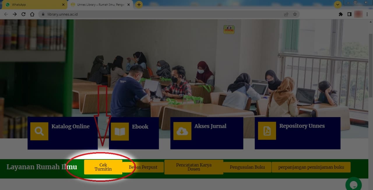 Pertama, buka website https://library.unnes.ac.id/, dan klik tombol Cek Turnitin.